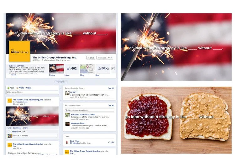 the miller group was looking to rebrand their facebook page. they’re a boutique advertising, marketing, media services, and strategic planning agency. the concept behind this campaign is that an idea is nothing without the strategy and planning behind it to execute it. using imagery, the viewer is asked to “connect the dots” with the picture, just like the miller group connects the dots with their strategic planning and campaigns.